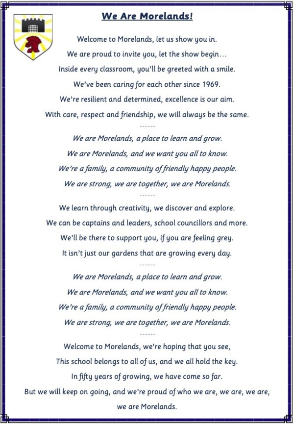 Education works best when it is a partnership between home and school. We encourage parents to play an active part in their child’s learning, attending meetings and events held in school; ensuring that their child completes their home learning as well as sharing and enjoying their child’s successes. Our school rules are “Together at Morelands we use kind words, kind thoughts and kind actions to all and our environment to be the best that we can be.” These rules set high expectations of how we expect our children to behave towards each other and the adults in the school as well as how they look after the school’s resources and grounds.